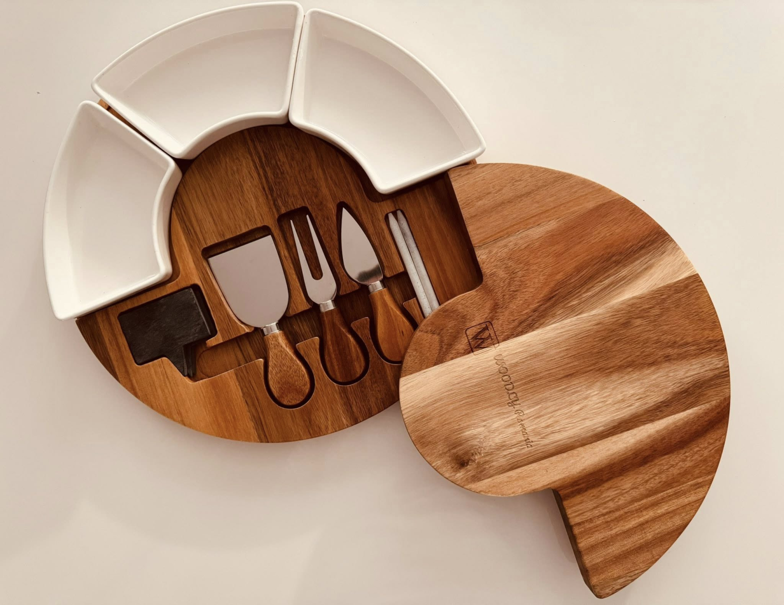 Platou elegant pentru brânzeturi din lemn de acacia, cu set de cuțite inclus
